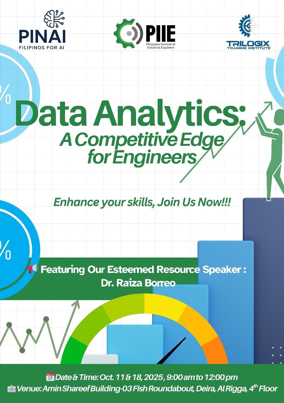 On October 11 & 18, 2025 the Philippine Institute of Industrial Engineers (PIIE) – UAE Chapter, in collaboration with Project PINAI led by Raiza Dimapilis Borreo and our training partner Trilogix Training Institute successfully delivered the two-session program “Data Analytics for Engineers.”