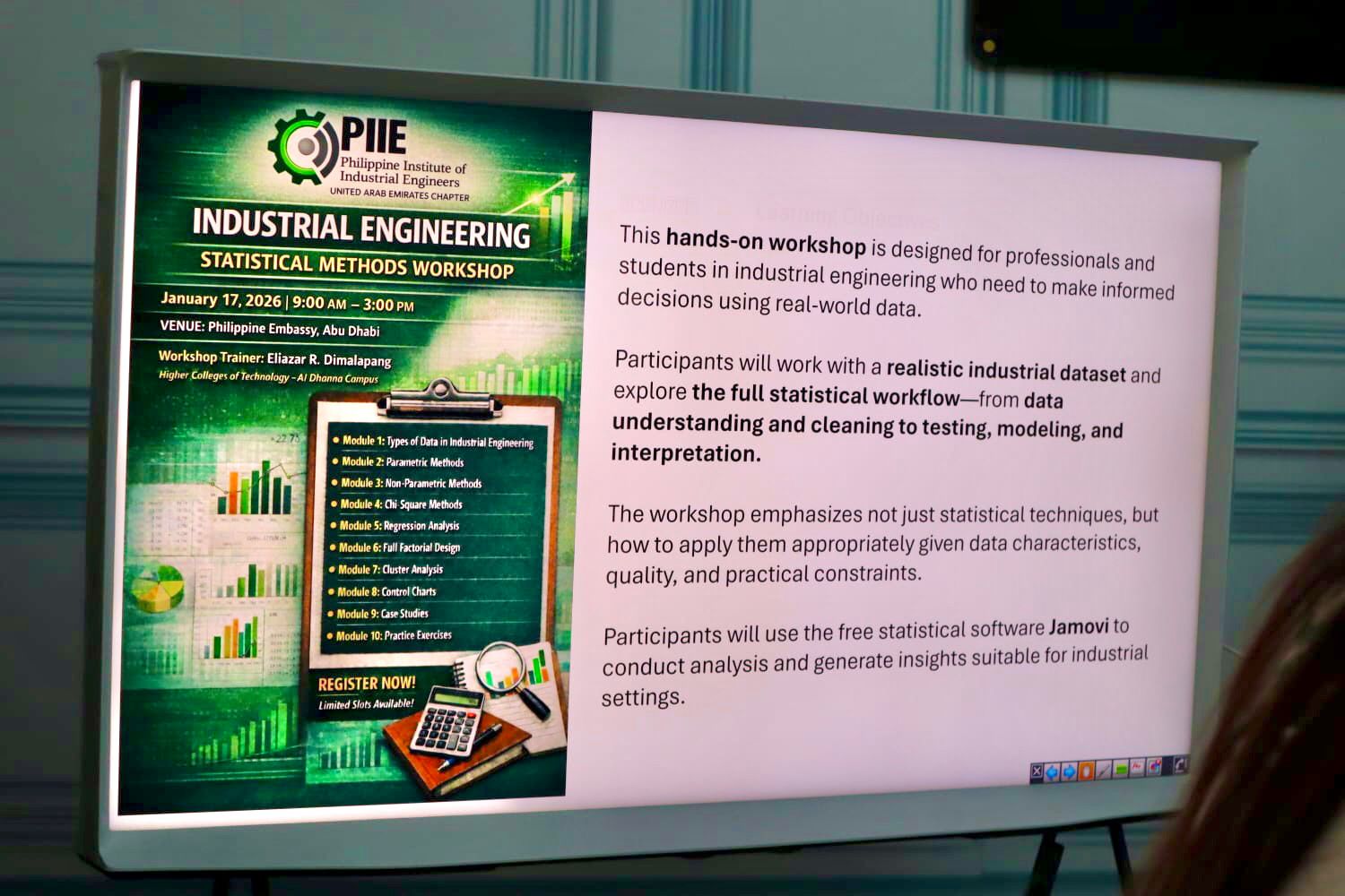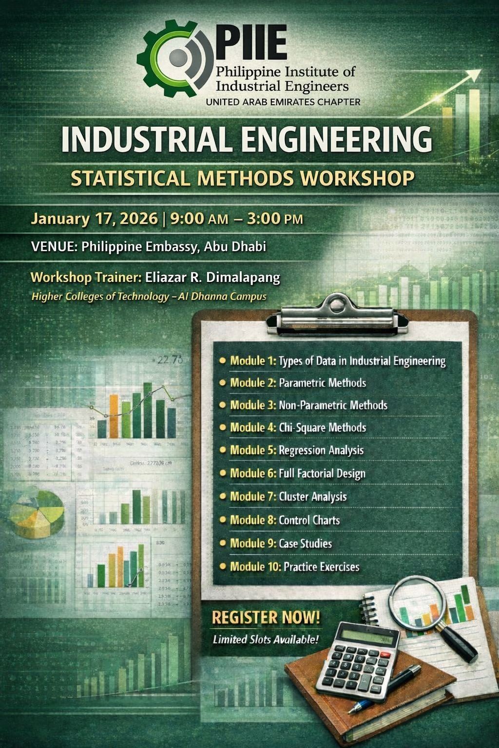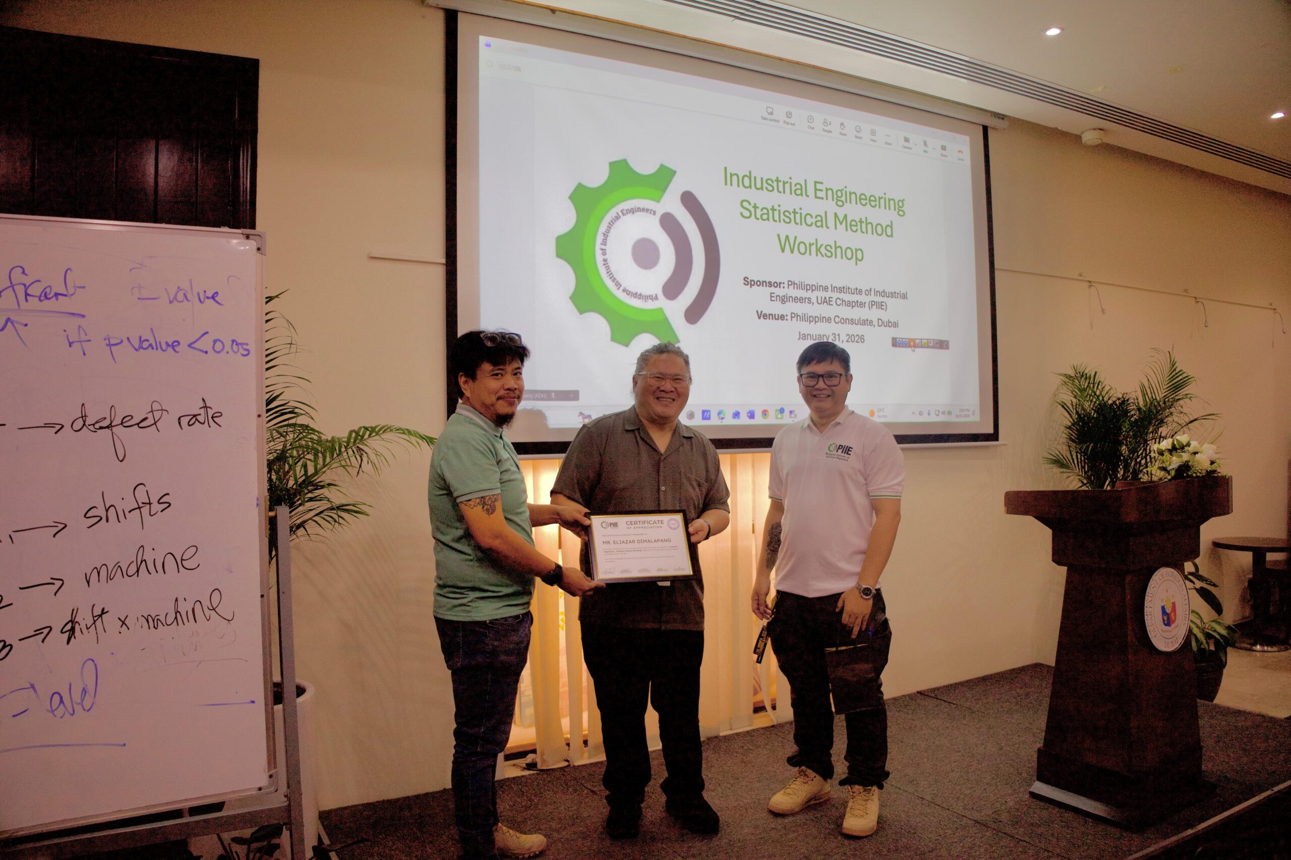 The Philippine Institute of Industrial Engineers (PIIE) successfully conducted the Industrial Engineering Statistical Methods Workshop at the Philippine Consulate General in Dubai as part of its continuing professional development initiatives for Filipino Industrial Engineers in the UAE.