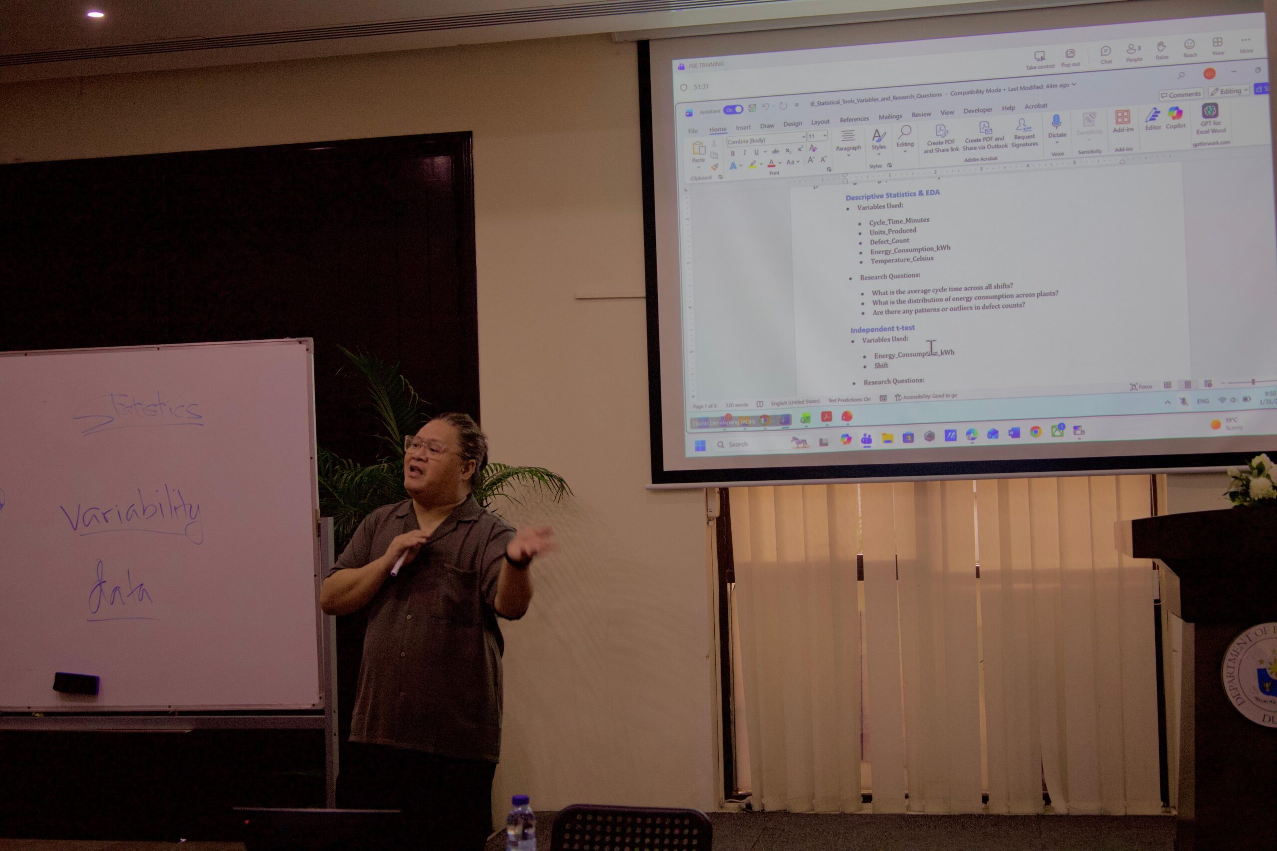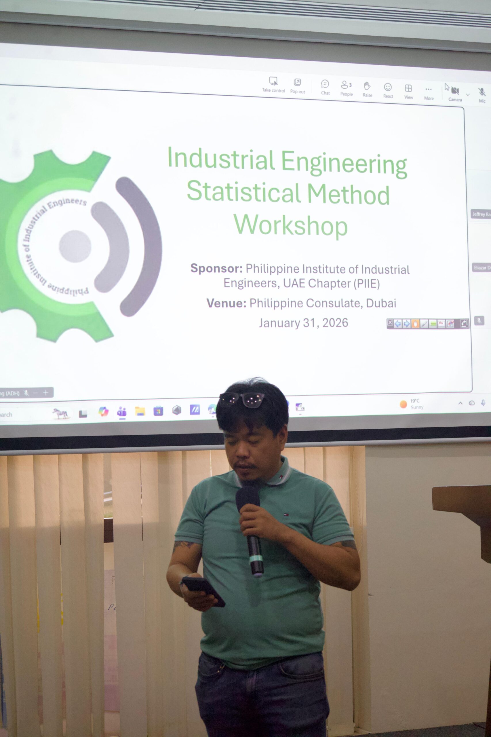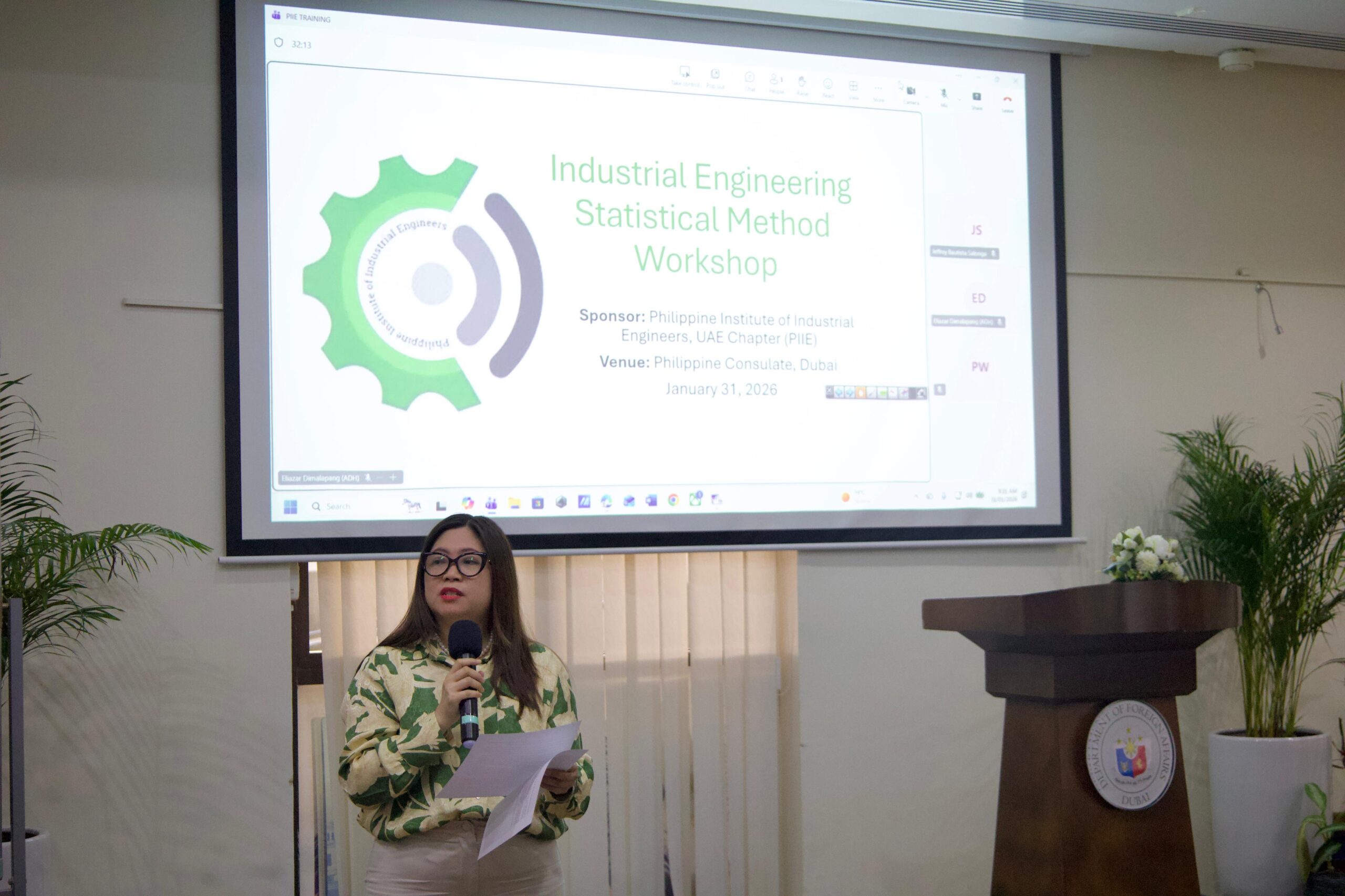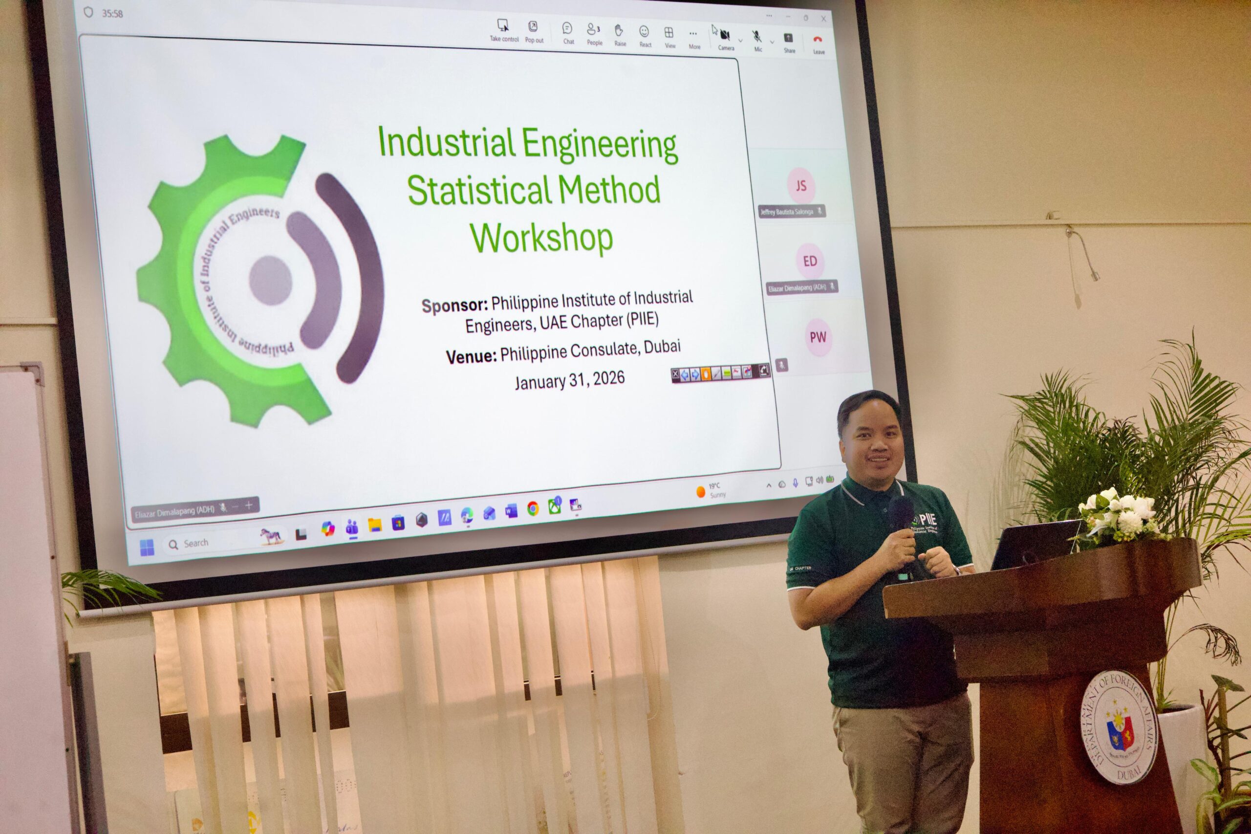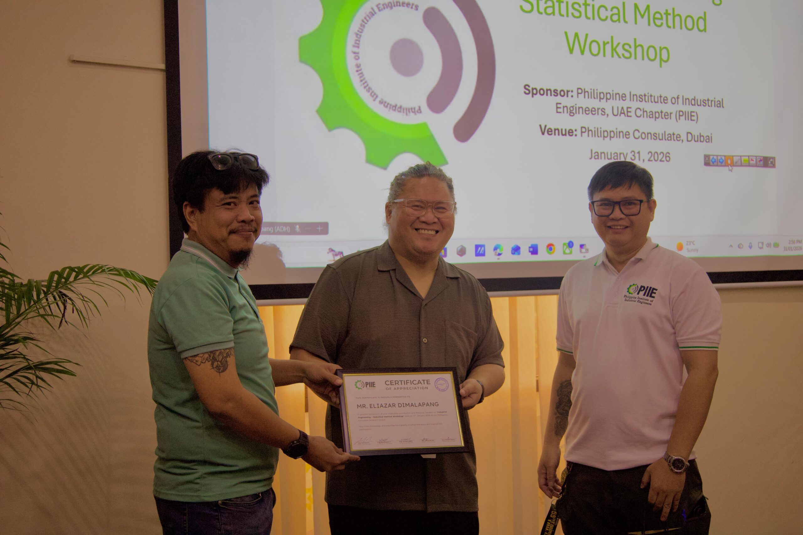 The workshop was led by Sir Ely (Eliazar R. Dimalapang), who shared practical insights and expertise on applying statistical methods in industrial engineering and Lean Six Sigma projects. PIIE extends its sincere appreciation to the Philippine Consulate General in Dubai, headed by Consul Ms. Aleah Marie Gica, for their strong support in making this learning activity possible.